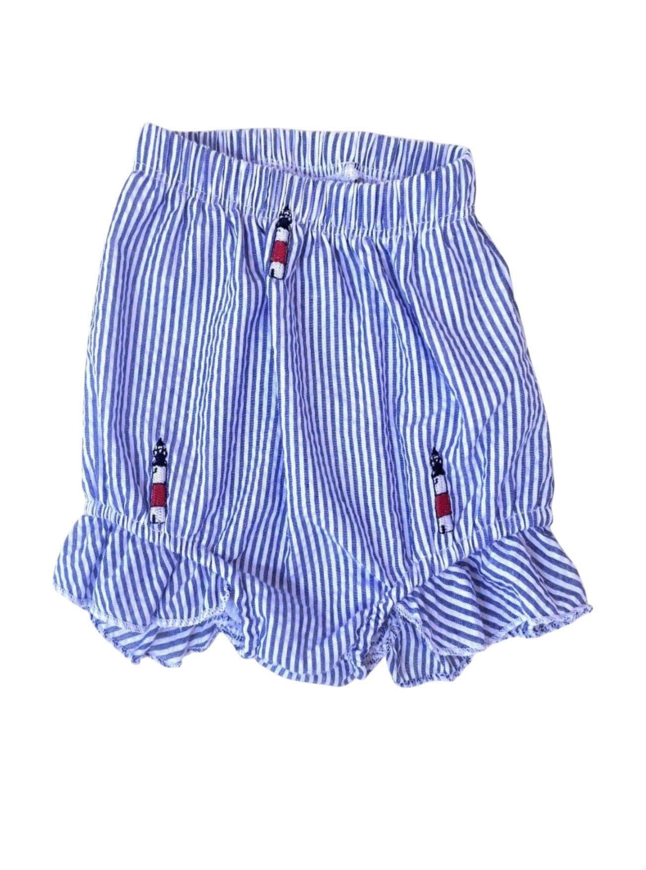 Blue embroider seersucker baby bloomers with embroidered Sankaty Nantucket lighthouse. Fully lined.