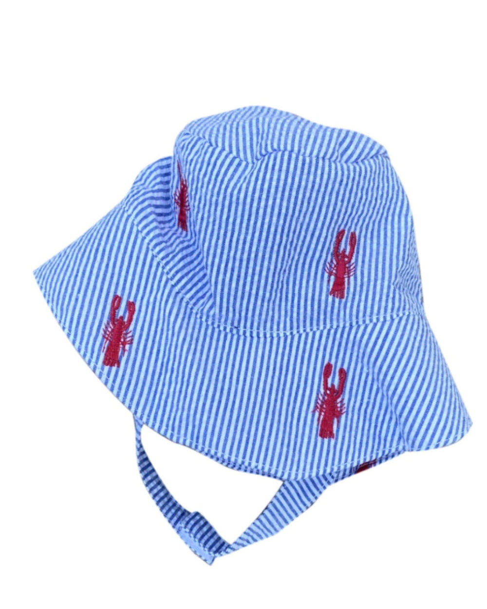 Blue and white seersucker bucket hat with red embroidered lobsters. Velcro closure.