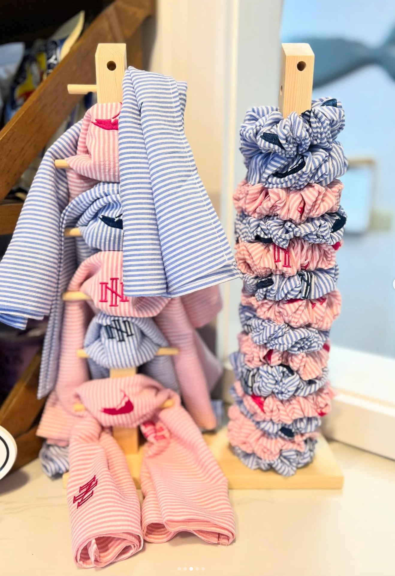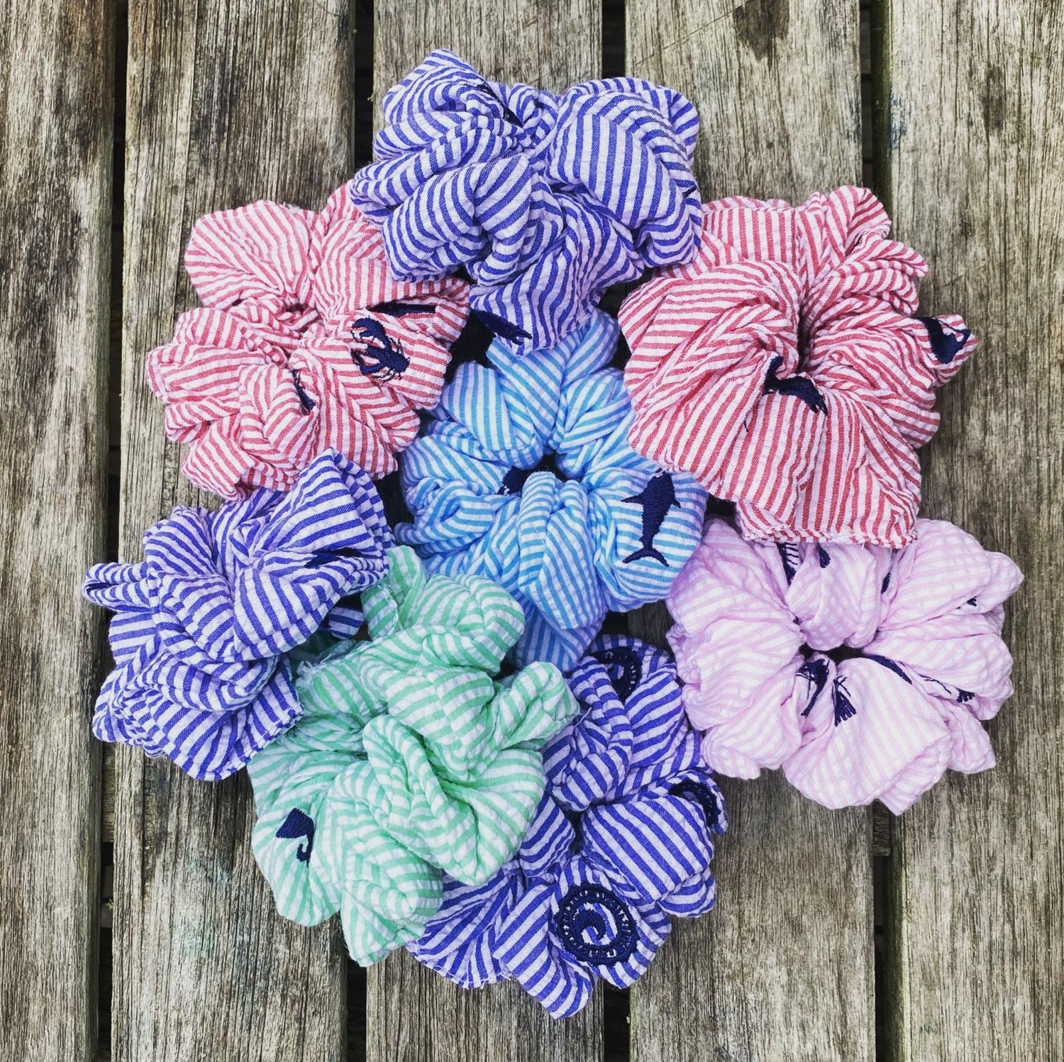 Seersucker scrunchies custom embroidered with your logo or design! This is an order for 30 scrunchies, turnaround time is 10 weeks. We will contact you to confirm design, email artwork or questions to hello@pipingprints.com. Price includes shipping.