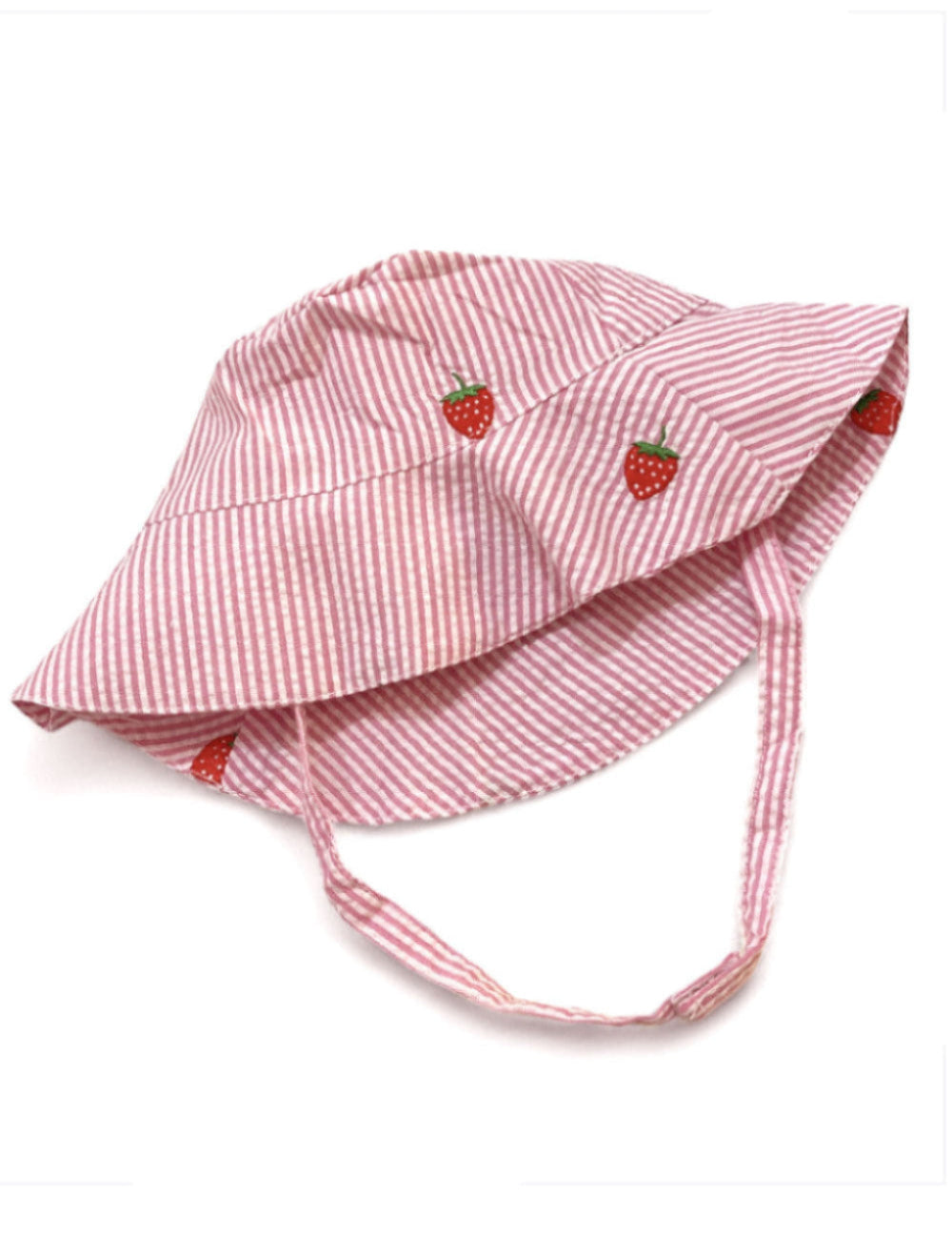 A sweet summer must-have! This hot pink striped seersucker baby bucket hat is embroidered with sweet strawberries. The secure Velcro closure ensures a snug, comfy fit while providing sun protection and style for your little one.