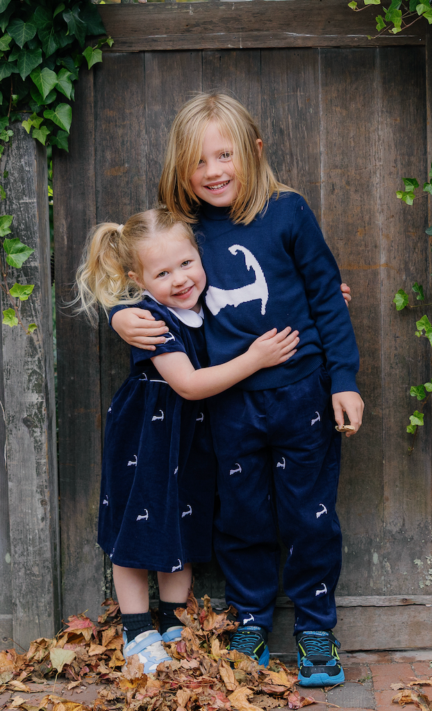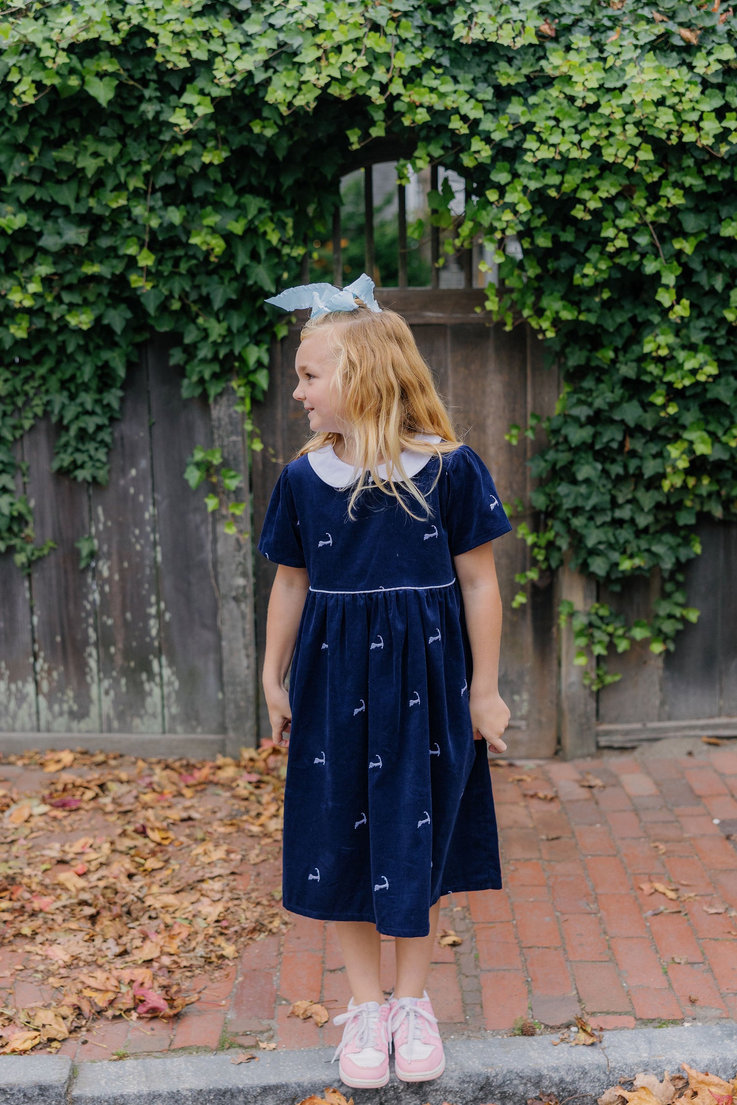 Inspired by the charm of Cape Cod’s seaside towns, this navy corduroy dress captures the spirit of coastal New England style. Featuring white embroidered Cape Cods, contrast piping trim, and a sweet Peter Pan collar, it’s both classic and whimsical. The top half is fully lined for comfort, with button closure down the back. A timeless favorite for holiday gatherings, family photos, and festive seaside celebrations.