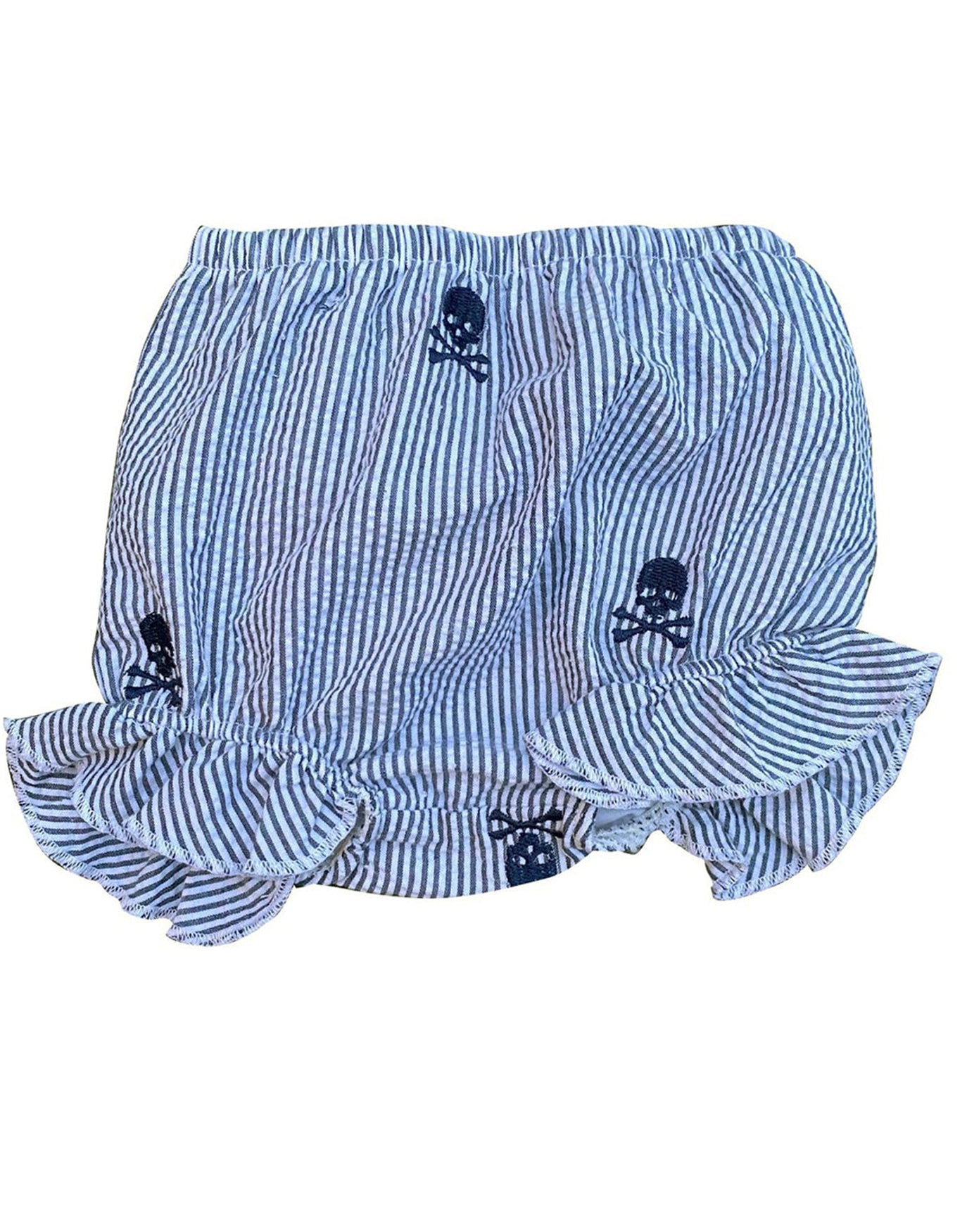 Navy seersucker baby bloomers with navy embroidered pirate skulls. Fully lined.