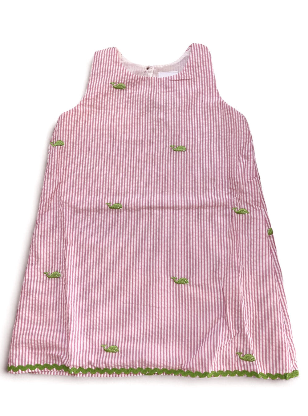 A playful twist on a timeless favorite! This pink striped seersucker shift dress is brought to life with bright green embroidered whales and finished with matching red ricrac trim for a cheerful coastal pop.