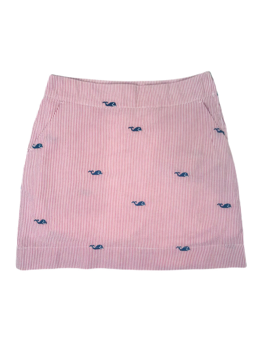 Red Seersucker Women's Skirt with Navy Embroidered Whales