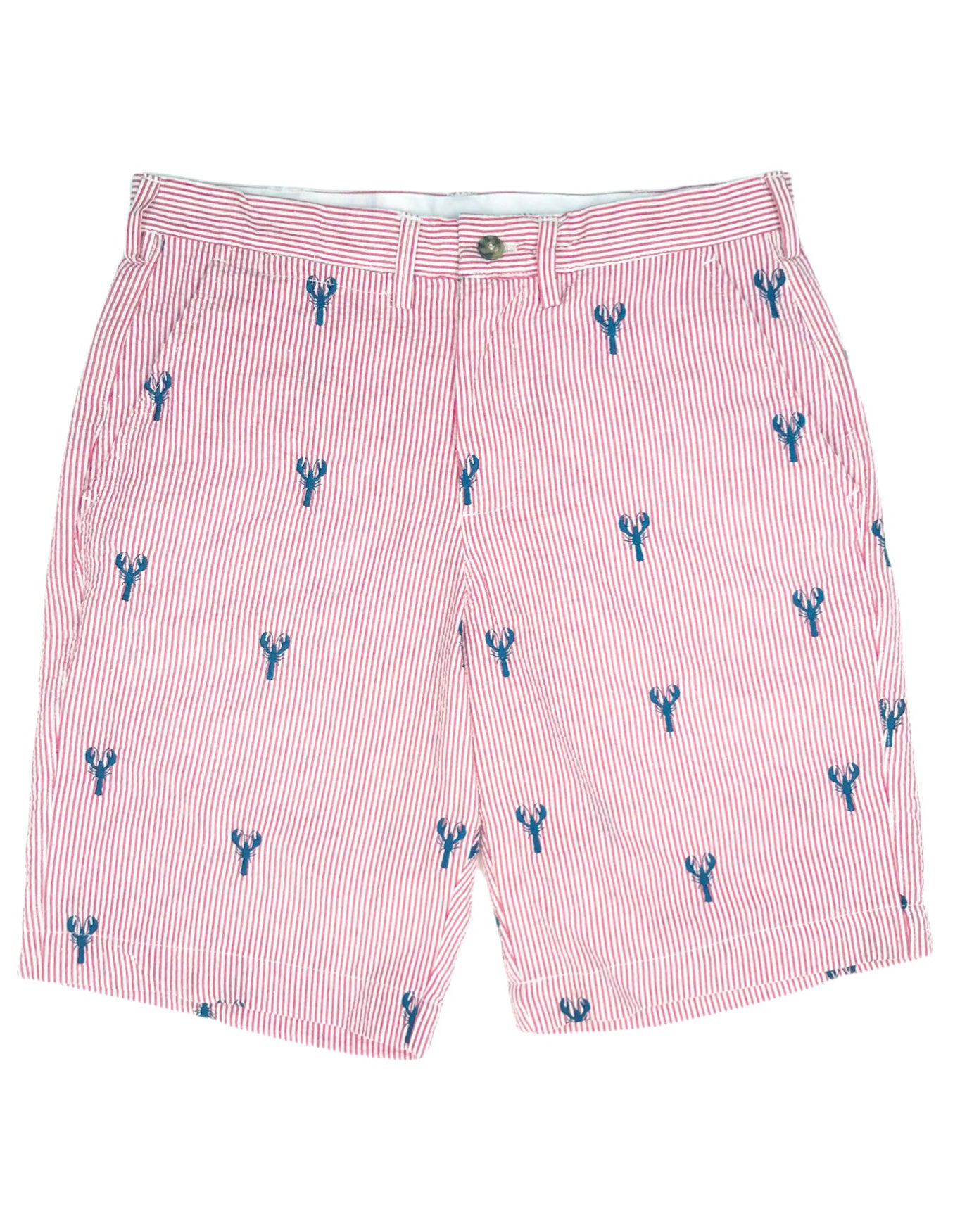 Red Mens Seersucker Shorts with Navy Embroidered Lobsters