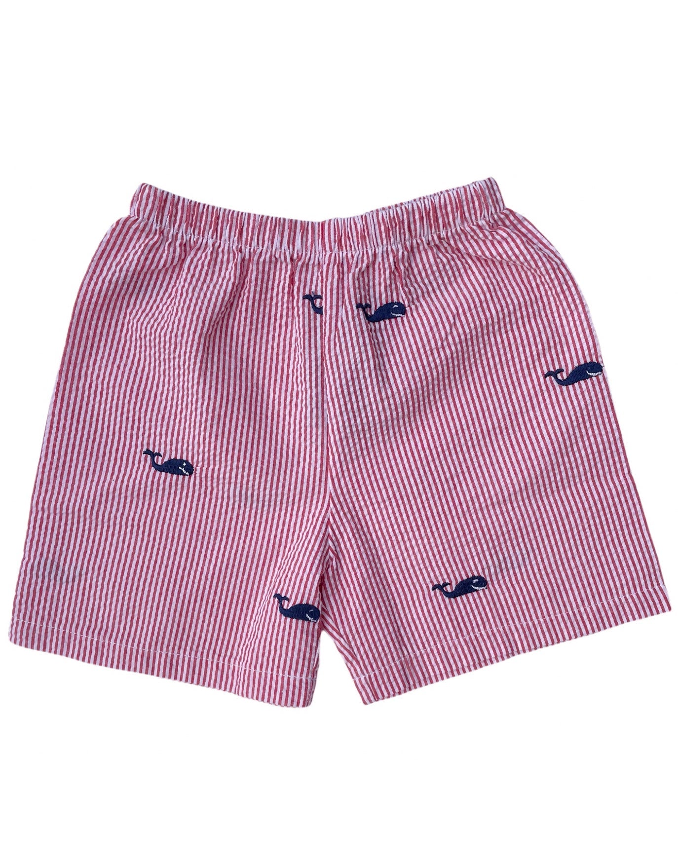 Red and white striped seersucker shorts with navy embroidered whales. Comfortable pull-on style elastic waist, back pocket.