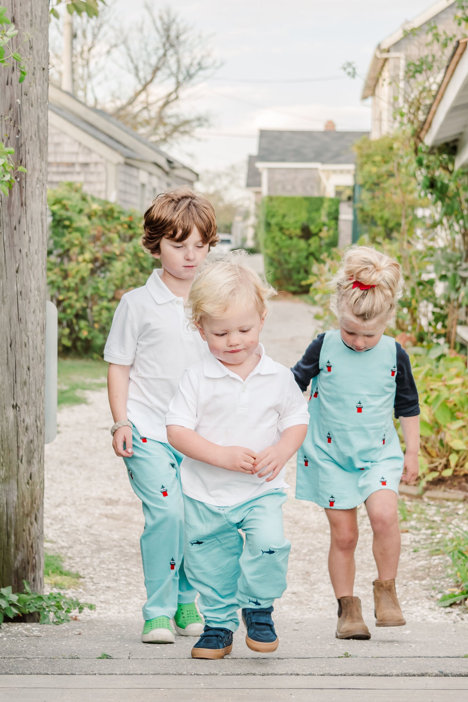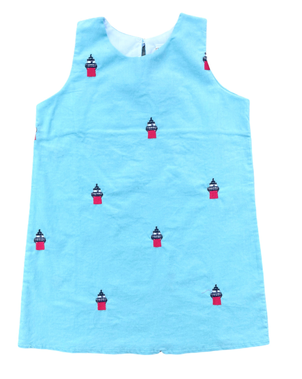 Turquoise corduroy dress with embroidered Duxbury Bay Lighthouse (aka Bug Light). Elastic waist, pocket in the back. Made of the softest 21 wale 100% cotton corduroy.