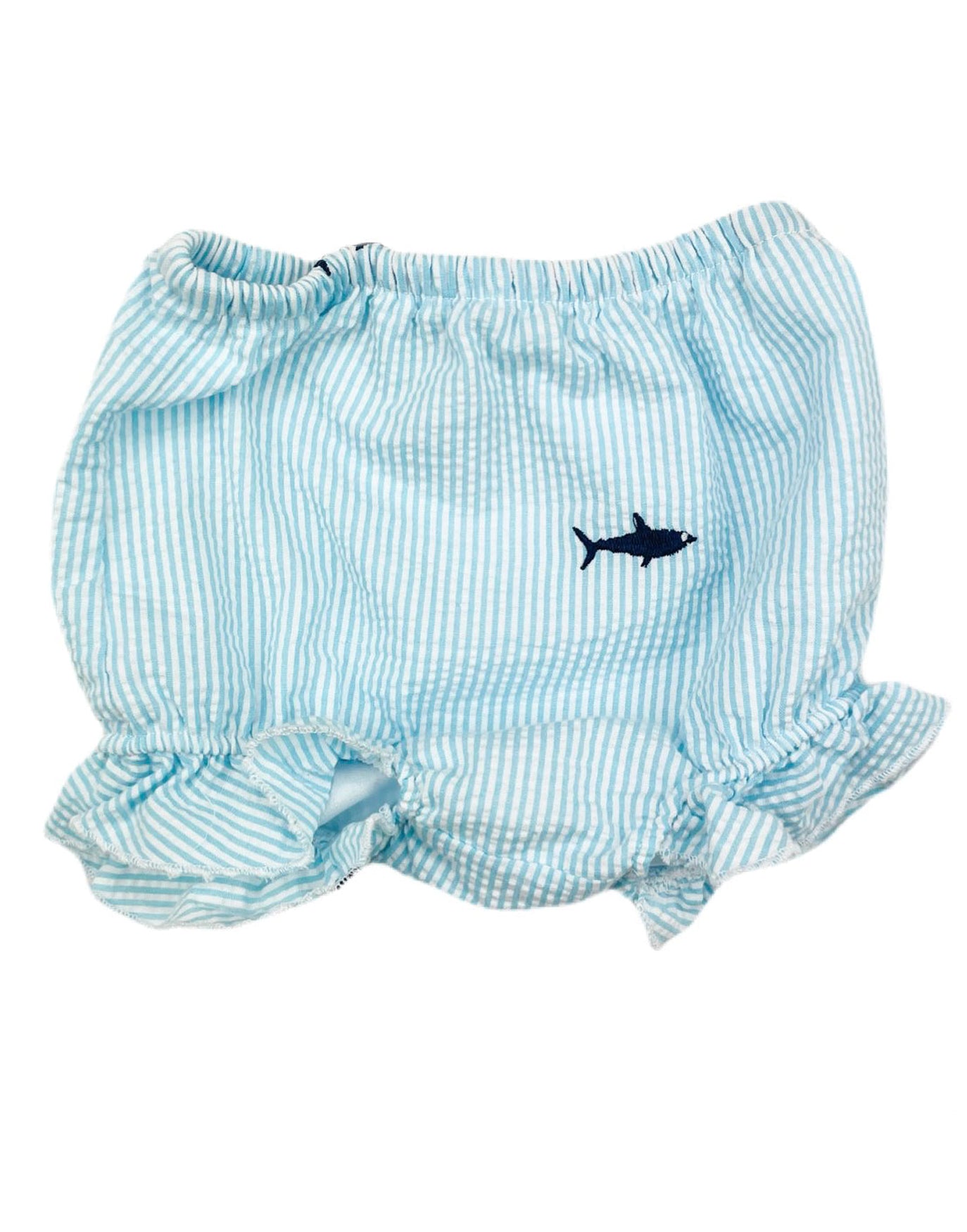 Turquoise Seersucker Baby Bloomers with Navy Embroidered Sharks