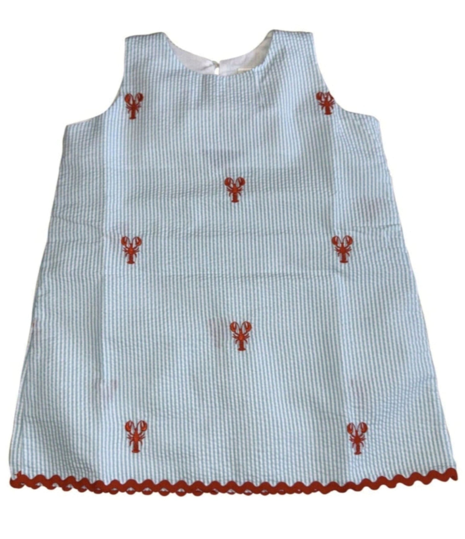 This classic shift dress is both casual and dressy. An instant favorite for your preppy girl. In turquoise and white striped seersucker with embroidered red lobsters, and red ric-rac trim!