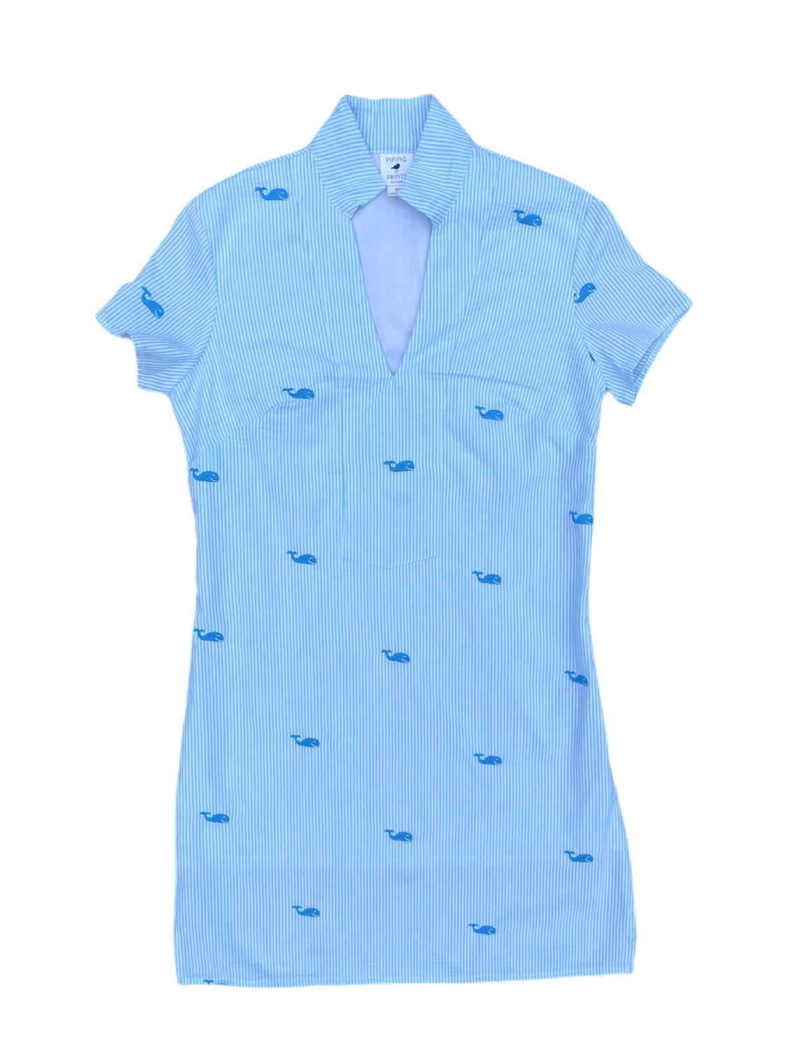 Turquoise seersucker short-sleeved tunic dress with turquoise embroidered whales. Fully lined, mandarin collar.