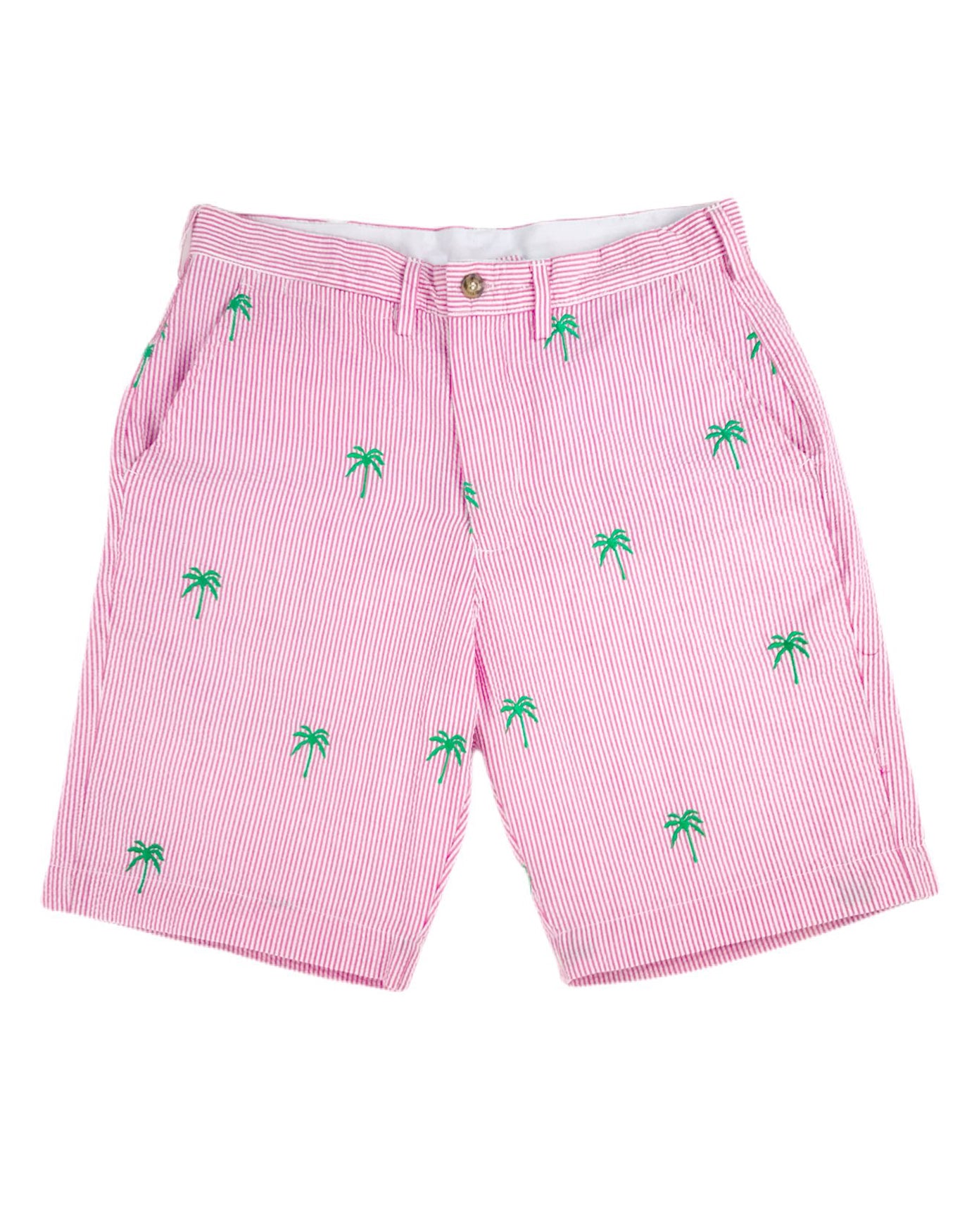 Pink Mens Seersucker Shorts with Green Embroidered Palm Trees