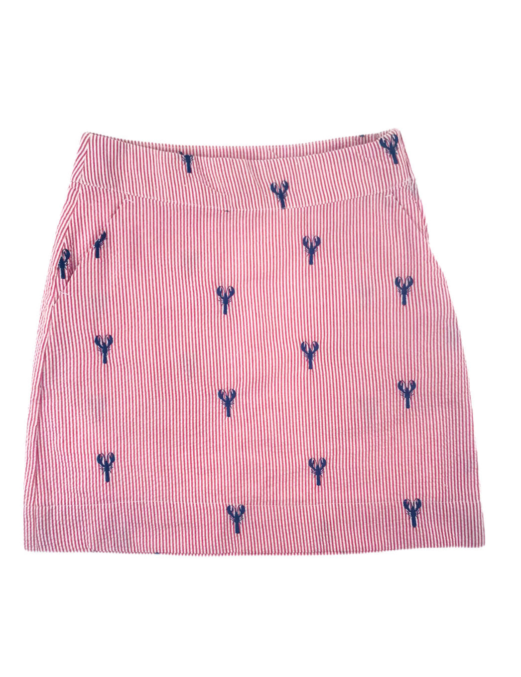 Red Seersucker Women's Skirt with Navy Embroidered Lobsters